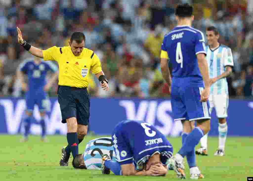Sudija Joel Aguilar daje žuti karton argentinskom igraču Marcosu Roji