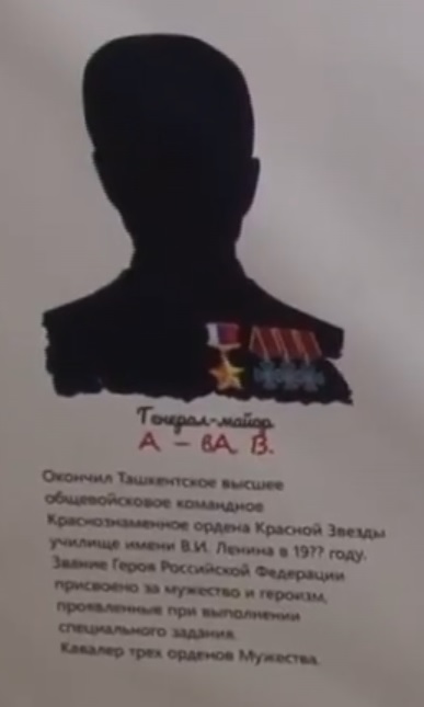 Umesto fotografije biografija sadrži samo crnu siluetu. Tvrdi da je osoba dobitnik odlikovanja Heroj Rusije. Formulacija na tabli sugeriše da se odaje počast bivšim diplomcima koji više nisu živi.