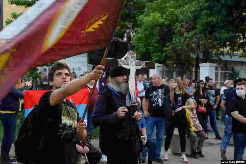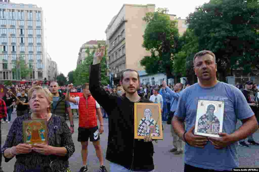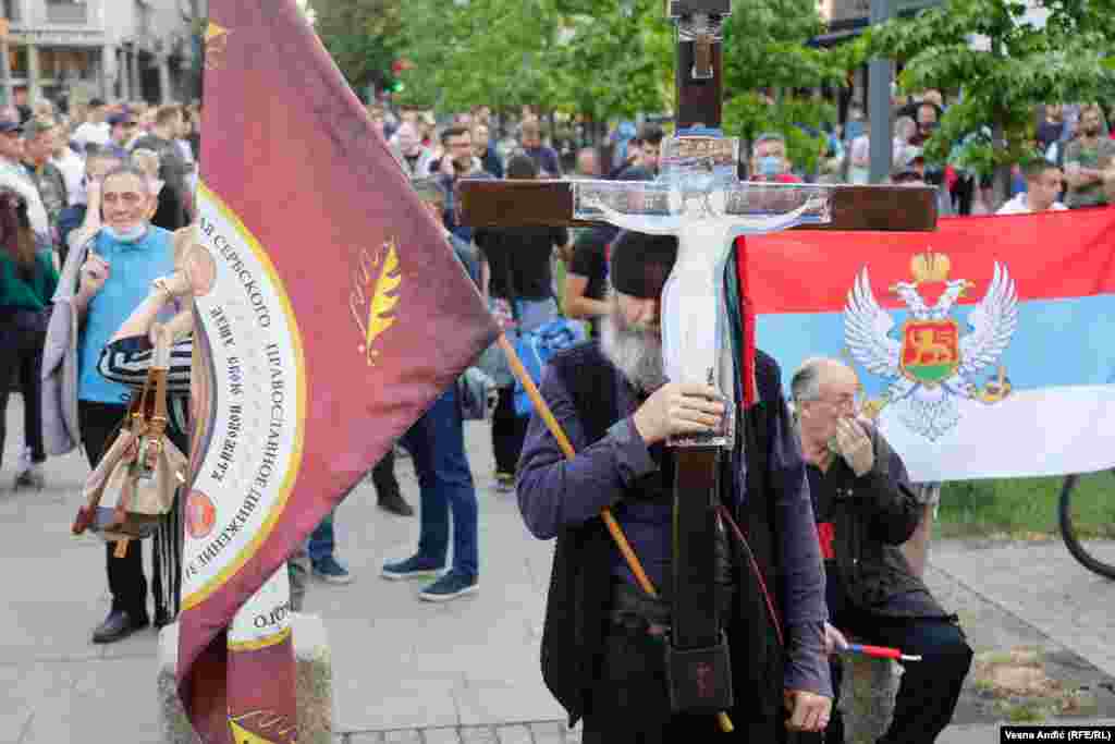 Okupljeni su nosili zastave Srbije, ikone i sveće i skandirali pogrdne povike predsedniku Crne Gore Milu Đukanoviću, ali i predsedniku Srbije Aleksandru Vučiću, kao i parole "Ne damo svetinje", "Srbija i Crna Gora, jedna familija".