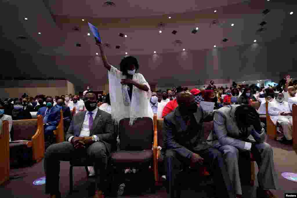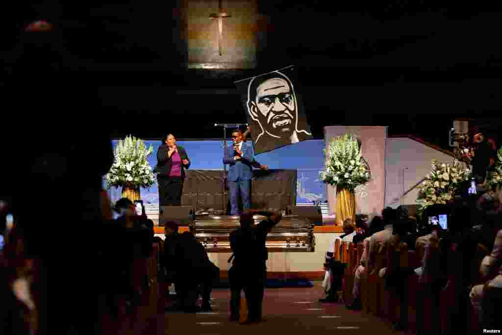 Ožalošćeni obučeni u crno, neki u majicama s porukom "Ne mogu disati" (I can't breathe), riječi koje je Afroamerikanac George Floyd izgovorio dok mu je policajac držao koljeno na vratu, okupili su se 9. juna u crkvi u Houstonu, Teksas, na sahrani Floyda, čija je smrt u policijskom pritvoru 25. maja podstakla na proteste protiv rasizma širom svijeta.