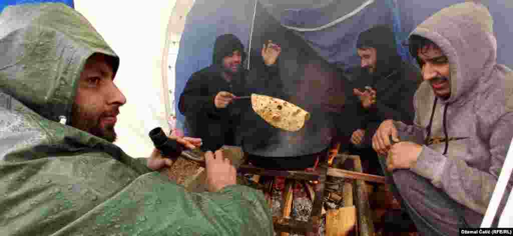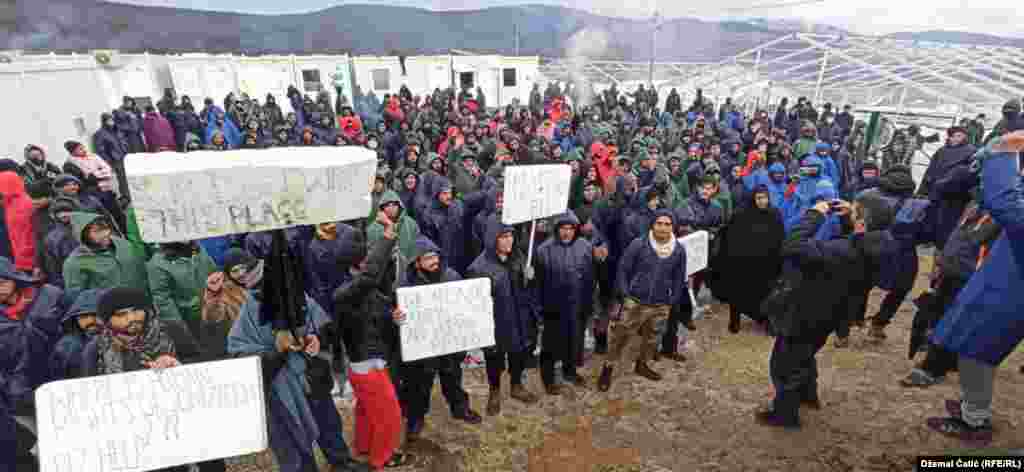 Izbjeglice i migranti koji se nalaze u kampu 'Lipa' prosvjedovali su u nedjelju 3. januara, tokom posjete predstavnika vlasti Bosne i Hercegovine i Unsko-sanskog kantona. Migranti borave u šatorima koje su postavili pripadnici Oružanih snaga BiH. U subotu, 2.januara migranti su odbijali hranu Crvenog krsta Bihaća, tražeći da budu premješteni u nekadašnji kamp 'Bira' u Bihaću. Vlasti Unsko-sanskog kantona i dalje se protive izmiještanju migranata u 'Biru' , uprkos odluci Vijeća ministara BiH da migranti trebaju biti izmješteni. FOTO: Džemal Ćatić