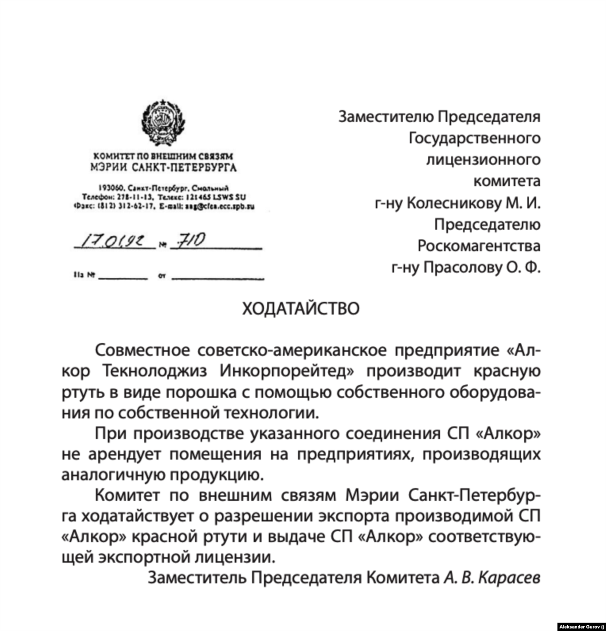 Očigledno, Prasolovo pismo nije imalo željeni efekat jer je u januaru 1992. državna agencija za izdavanje dozvola primila još jedan dopis o Alkoru - ovoga puta od Komiteta iz Sankt Peterburga. U dopisu, koji je potpisao Putinov zamenik Anatolij Karasev, od agencije se traži da Alkoru dodeli dozvolu za izvoz crvene žive.