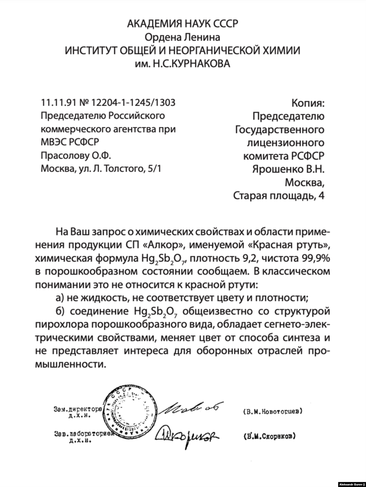 U novembru 1991, šef agencije u Ministarstvu za ekonomske odnose sa inostranstvom koja je nadgledala dodelu izvoznih kvota, Oleg Prasolov, napisao je uputstvo državnoj agenciji za izdavanje dozvola da odobri izvoz 400 kilograma crvene žive proizvedene u Alkoru, i to u Mađarsku za suma od 30 miliona dolara. Uz njegovo pismo priložena je stručna analiza Alkorove crvene žive, koju je uradio Institut za opštu i neorgansku hemiju Akademije nauka.