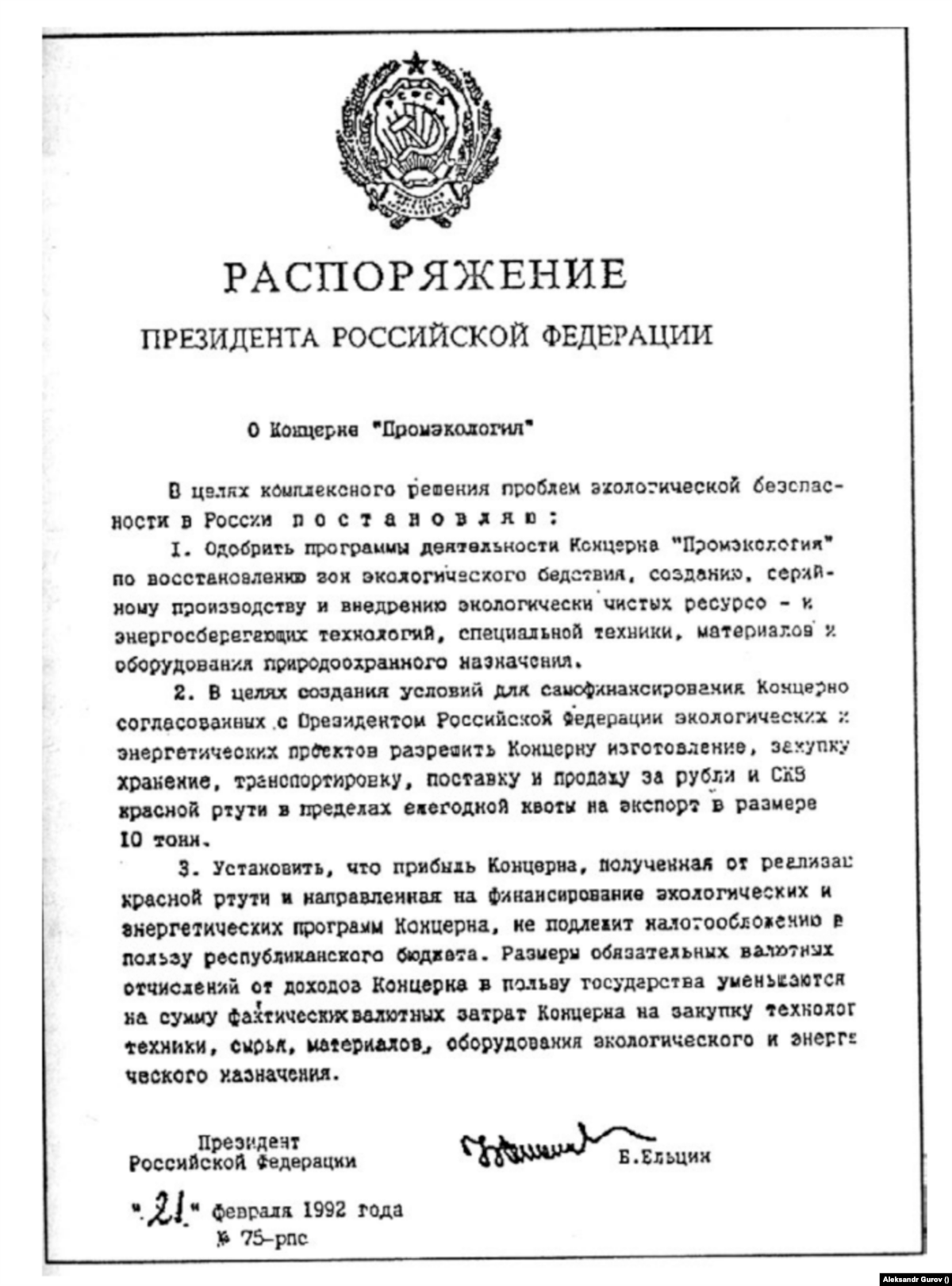 Dok je Putin mogao lako da distribuira izvozne dozvole za drvo, naftu i druge proizvode pod ovlašćenjem ruske vlade, pitanje dozvole za izvoz navodno opasne supstance kao što je crvena živa bilo je nešto teže.