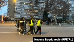 Redari su okružili demonstrante i niko ne prilazi blizu reporterke.