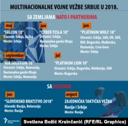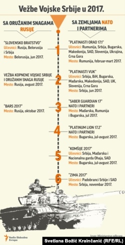 U protekloj godini, prema podacima specijalizovanog portala Balkanska bezbednosna mreža (balkansec.net), Srbija je održala 17 vojnih vežbi sa drugim zemljama - od toga je 13 vežbi bilo sa NATO i partnerima, a sa Rusijom četiri vojne vežbe.