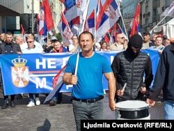 Mnogi od prisutnih nose zastave Srbije, a može se videti i veliki baner sa porukom "Ne damo Niš".