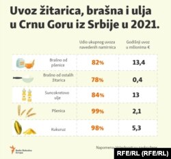 Naime, Crna Gora iz Srbije uvozi oko 90% poljoprivrednih proizvoda, kao što su pšenica, kukuruz, ulje. Povodom rasta cijena brašna i žitarica na berzama, te moguće nestašice, najavljeni su razgovori predstavnka pekarske industrije i Vlade.