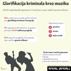 Osam od 20 najslušanijih pjesama u Crnoj Gori sadrži upravo ovakve stihove, pokazalo je istraživanje nevladine organizacije Juventas, sprovedeno od avgusta prošle do avgusta ove godine.