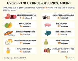 Prema podacima sa sajta MONSTAT-a u januaru ove godine, od ukupnog uvoza hrane, iz Srbije je uvezeno 31 posto, a od zemalja regiona tu su Bosna i Hercegovina sa sedam posto i Hrvatska sa skoro šest posto.