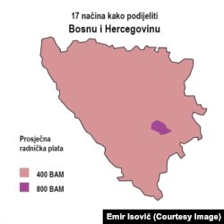 Među 17 podjela je i ona koja zemlju "dijeli" na osnovu prosječne plate. Tako je glavni grad zemlje, Sarajevo, gdje su smještene skoro sve državne i međunarodne institucije, označeno kao grad sa najvećom prosječnom platom od 800 maraka (oko 400 eura). U ostatku zemlje, prema karti, plata je duplo manja i iznosi 400 maraka (oko 200 eura).