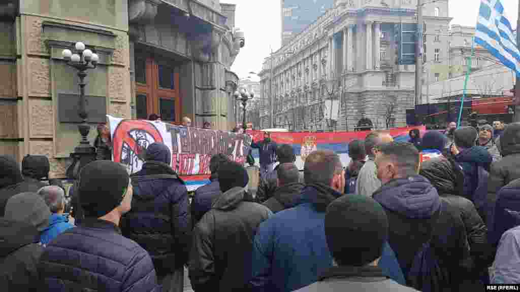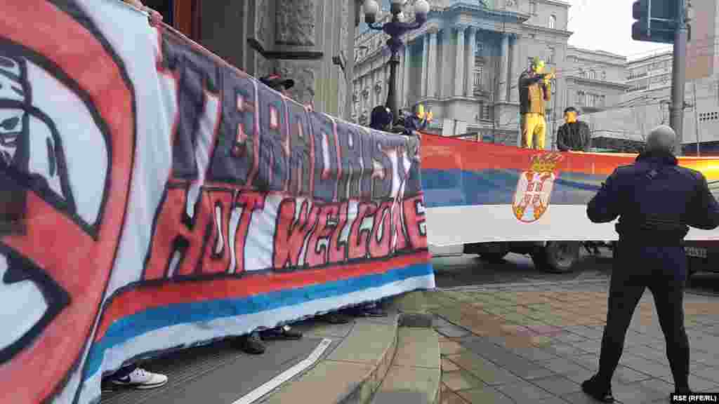 Ispred Vlade Srbije okupljeni su razvili transparent sa porukom "Terrorists not welcome" (Teroristi nisu dobrodošli)