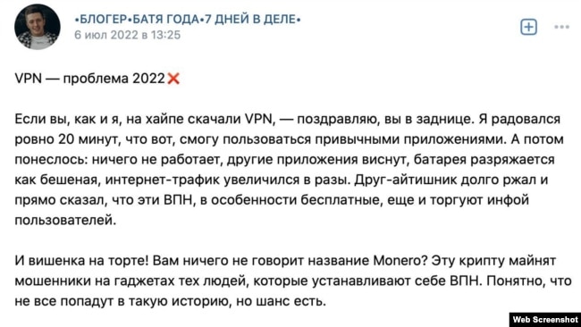 "Ako, vi, kao i ja preuzmete VPN nakon sve pompe, čestitam vam što ste prevareni", napisao je 6. jula bloger Batja-Goda, koji ima 46.000 pratilaca, u sada obrisanom postu na društvenim medijima. "Bio sam sretan nekih 20 minuta, koristio sve omiljene aplikacije. Ali onda se sve raspalo, ništa ne radi, druge aplikacije su izvisile, baterija mi se troši kao luda, pristup internetu usporen. Prijatelj koji je u IT sektoru kaže, VPN. Naročito besplatni servisi VPN-a prodaju podatke korisnika."