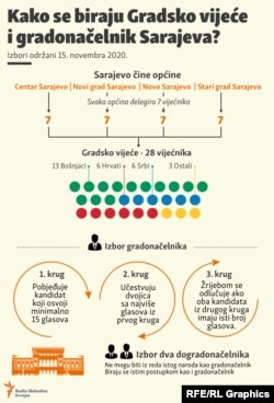 U Sarajevu, glavnom gradu BiH, vijećnici iz četiri opštine, koji se biraju direktno na izborima, prvo biraju sastav Gradskog vijeća, nakon čega ovo novoformirano tijelo bira gradonačelnika.