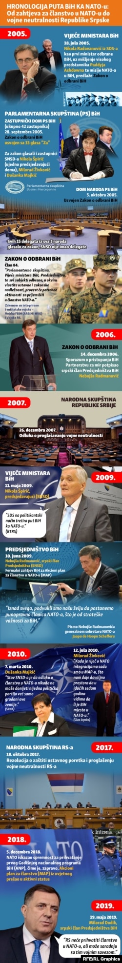 Milorad Dodik, predsjednik SNSD-a, je te 2009. govorio kako “mi treba da se nađemo u NATO savezu”, ali je već tada spominjao da se treba ispuniti “proceduru koja mora da manifestuje volju ljudi koji žive ovdje”.