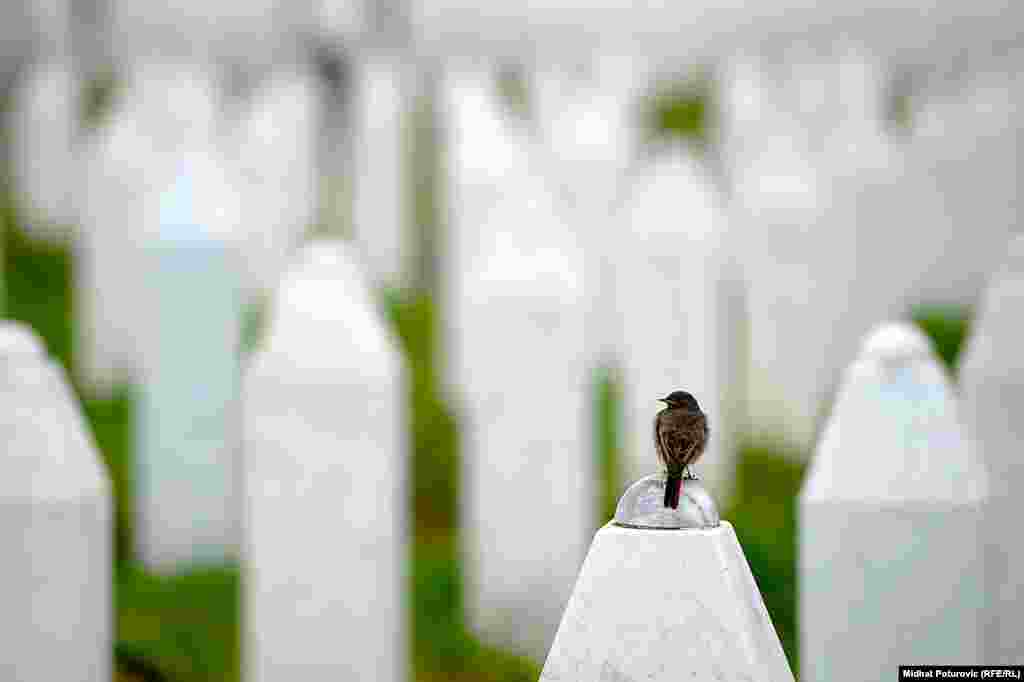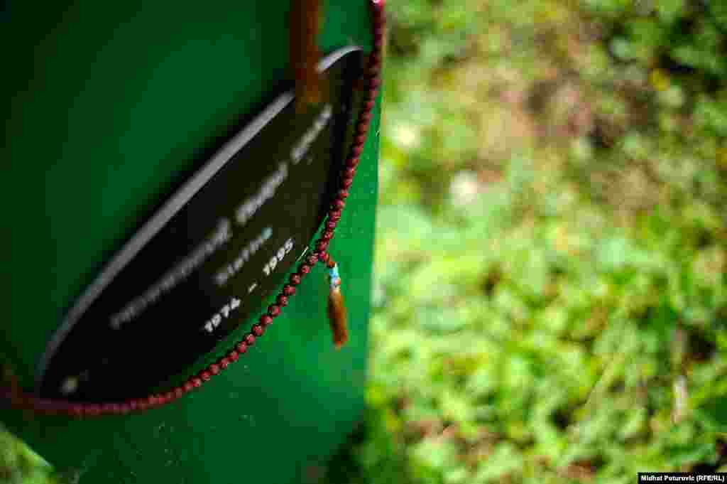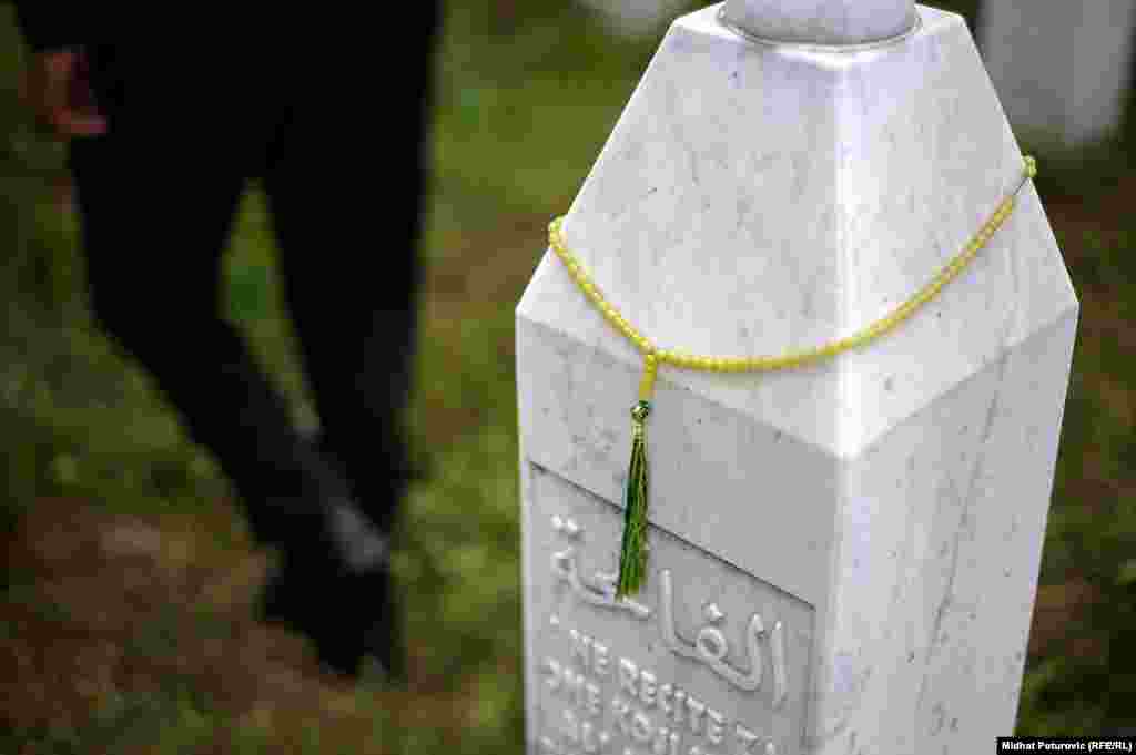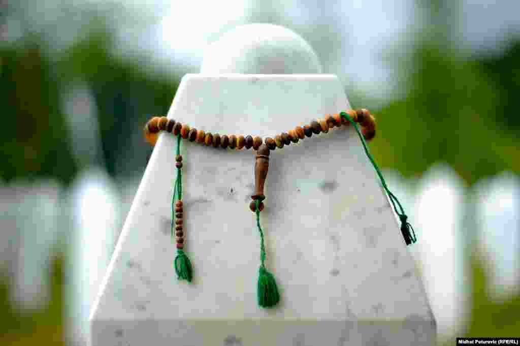 Dan nakon obilježavanja 19. godišnjice genocida nad Bošnjacima u Srebrenici, povremeni cvrkut ptica naruši tišinu u Potočarima gdje pažnju privlače nišani na kojima su ostavljeni tespihi korišteni tokom molitve svih ovih godina. Od 8.372 imena, uklesanih na spomen-ploču na mezarju u Potočarima, ostalo je još oko hiljadu duša koje čekaju na konačan smiraj. RSE/Foto: Midhat Poturović