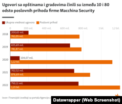 Na ovaj način pomenutoj firmi dodeljeni su poslovi vredni oko 27 miliona evra tokom poslednjih pet godina. Podaci pokazuju da su ugovori sa opštinama i gradovima u Srbiji činili i do 80 odsto poslovnih prihoda firme Macchina Security.