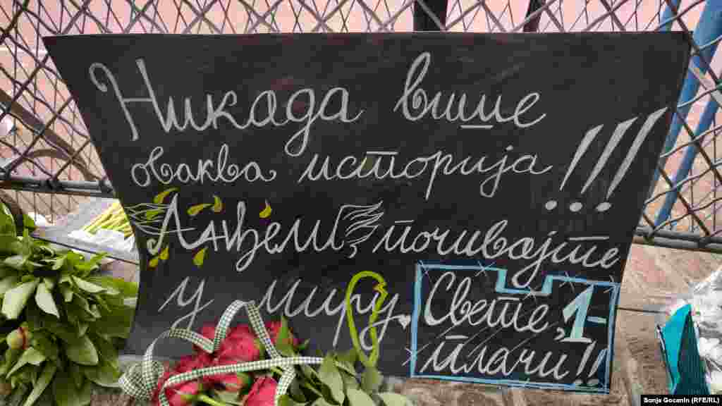 Transparent "Počivajte u miru, anđeli" na skupu ispred škole.