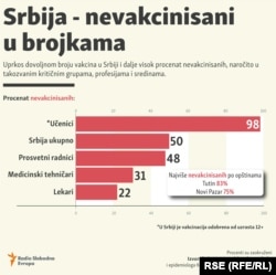 Srbija beleži nešto više od polovine (50 odsto) vakcinisanog odraslog stanovništva, a evropski prosek je gotovo 20 odsto veći. U Evropskoj uniji je(EU), prema zvaničnim podacima Evropske komisije, 70 odsto odraslog stanovništva primilo obe doze vakcine.