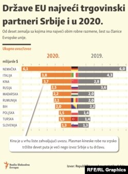 EU je i u 2020. bila najveći spoljnotrgovinski partner Srbije. Podaci nadležnog ministarstva pokazuju da je vrednost ukupne robne razmene Srbije i EU iznosila 28,1 milijardu dolara, što čini 61,4 odsto ukupne trgovinske razmene Srbije sa svetom.
