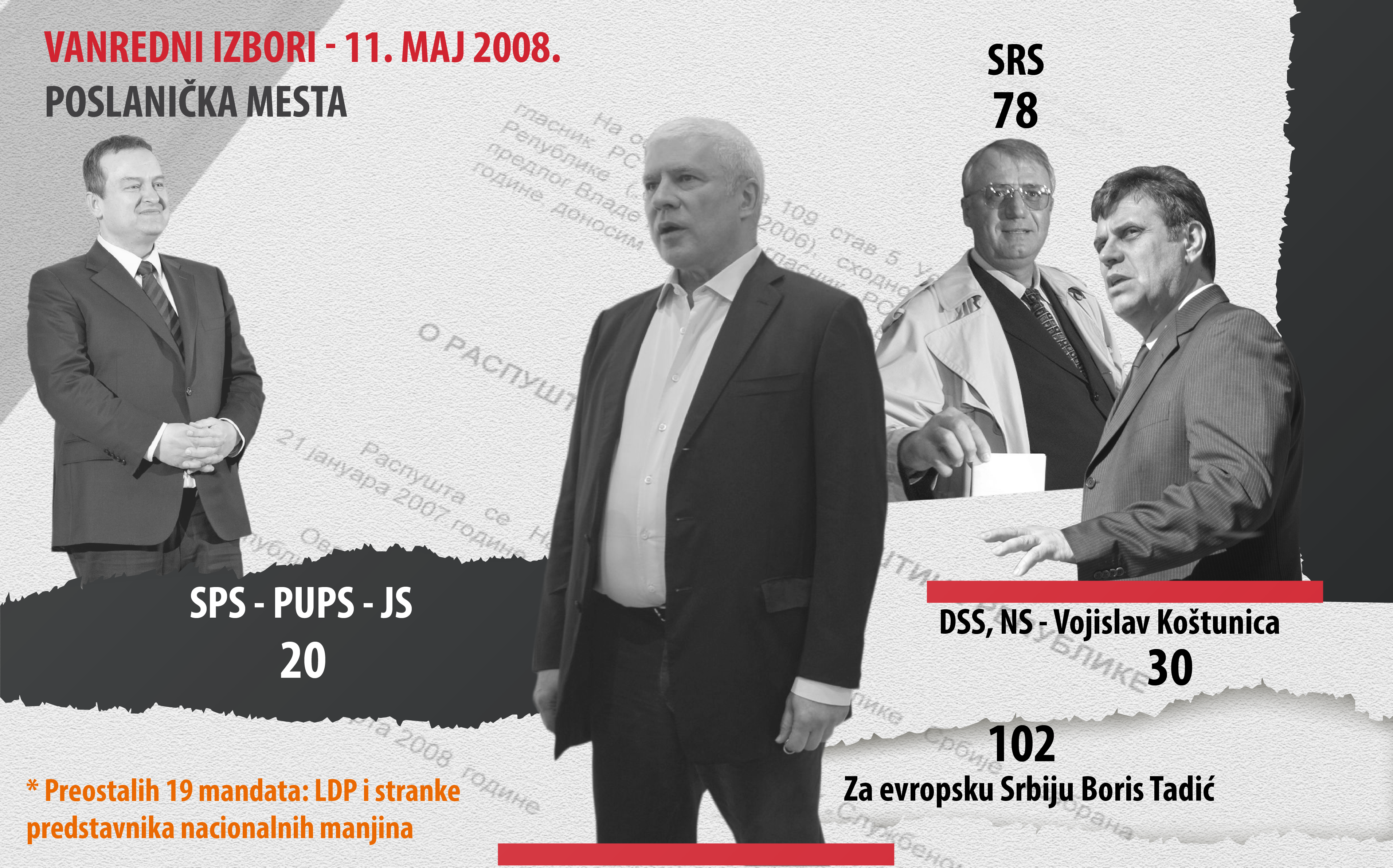 Predsednik Srbije, Boris Tadić, raspisao je nove vanredne izbore za 11. maj 2008. godine. Dotadašnji saziv Skupštine nije radio ni godinu i po dana.