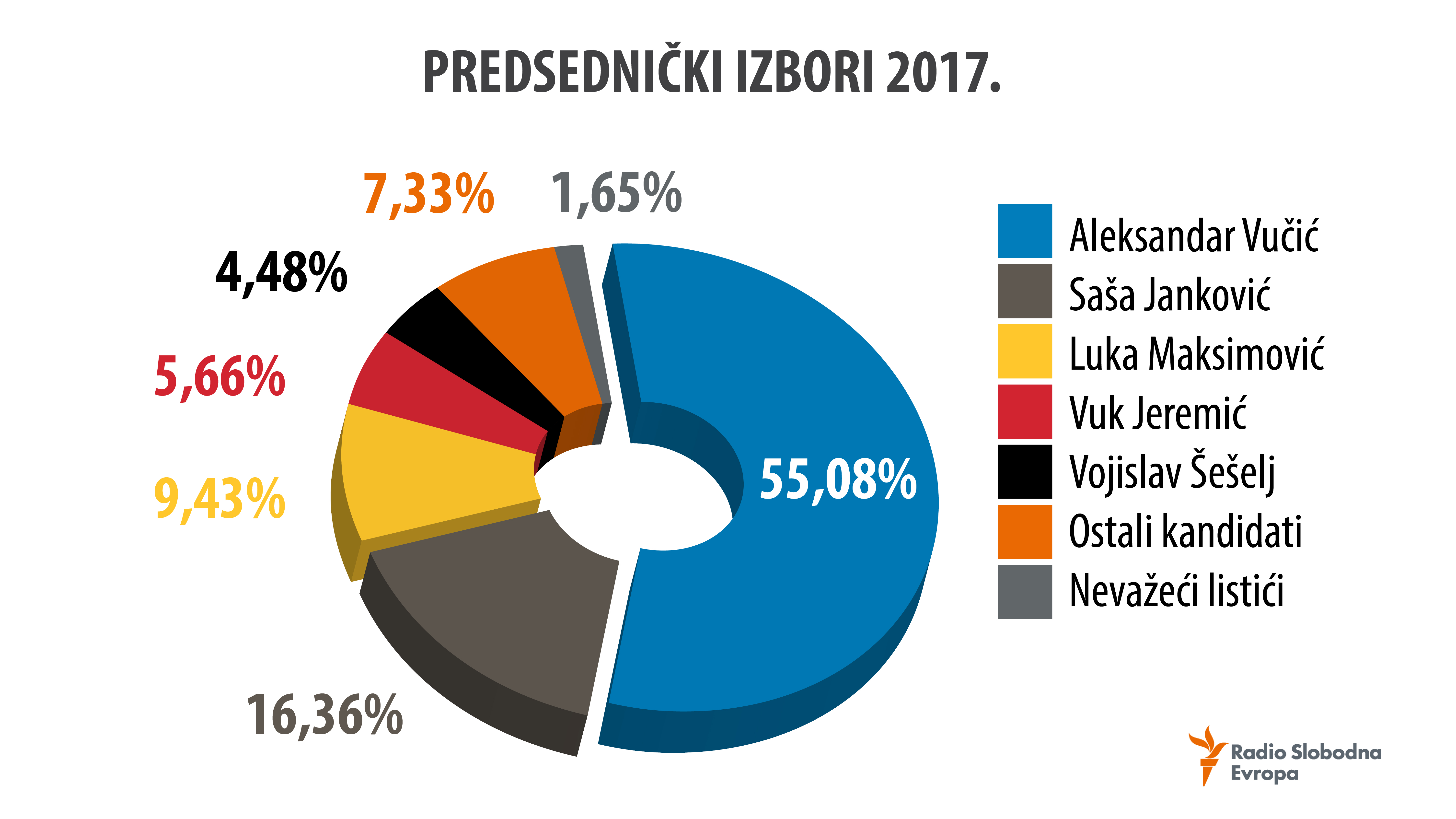 Održani su u redovnom terminu. U tom trenutnu predsednik Vlade Aleksandar Vučić najavio je da će se kandidovati za predsednika Srbije. Na izborima 2. aprila 2017. godine Vučić je kao jedinstveni kandidat osam stranaka osvojio 55,08% glasova. Iza njegovog imena, pored naprednjaka, bile su, između ostalih, Socijalistička partija Srbije, Jedinstvena Srbija-PUPS, Pokret socijalista, Srpski pokret obnove, Savez vojvođanskih Mađara.