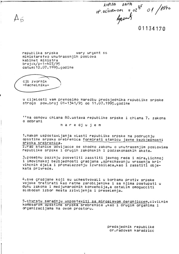 Predsjednik Republike Srpske Radovan Karadžić donosi naredbu u kojoj se navodi da “nakon uspostavljanja vlasti Republike Srpske na području opštine srpska Srebrenica formirati stanicu javne bezbjednosti srpska Srebrenica.” U istoj naredbi se navodi da sve građane koji su učestvovali u borbama protiv srpske vojske treba tretirati kao ratne zarobljenike.