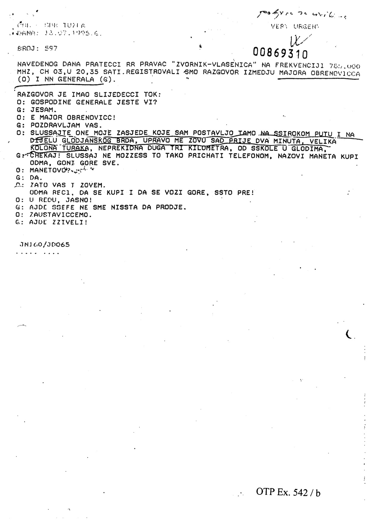 U presretnutom razgovoru majora Dragana Obrenovića i nepoznatog generala navodi se da se kolona ljudi dugačka dva do tri kilometra kreće u blizini škole u Glodima.