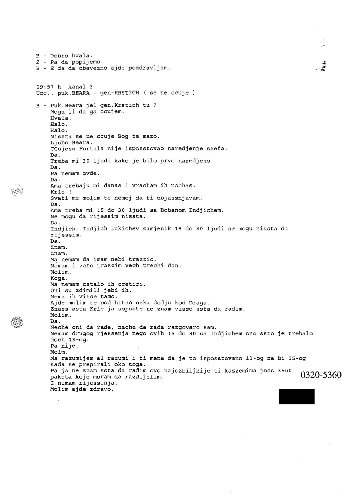 Nakon što su krenula masovna pogubljenja, u presretnutom razgovoru između pukovnika Ljubiše Beare i generala Radislava Krstića Beara traži dodatno pojačanje.