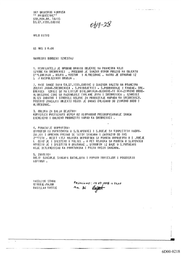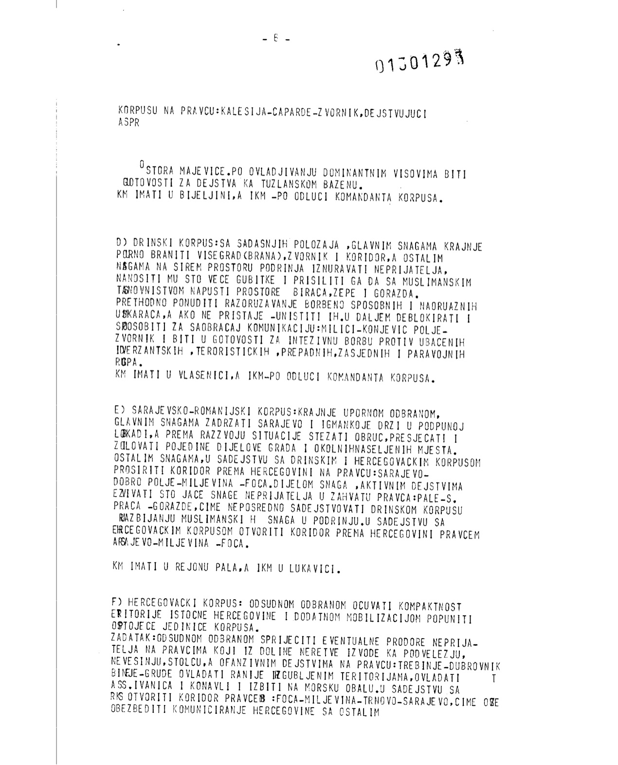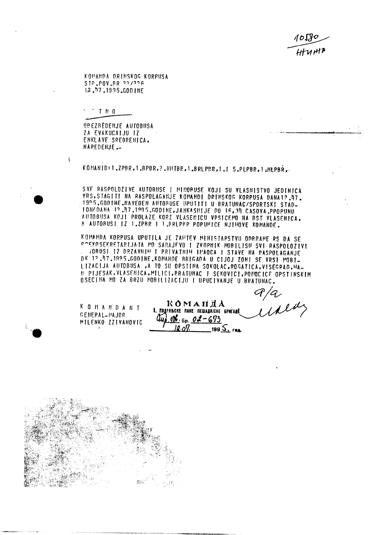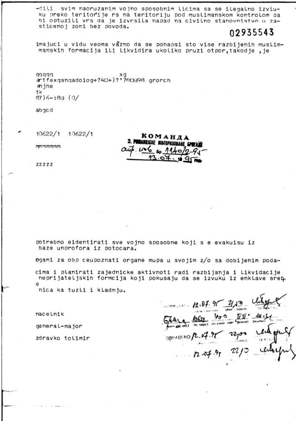 “Imajući u vidu veoma važno da se pohapsi što više razbijenih muslimanskih formacija ili likvidira ukoliko pruži otpor, također je potrebno evidentirati sve vojno sposobne koji se evakuišu iz baze UNPROFOR-a iz Potočara. (…) Sa dobijenim podacima planirati zajedničke aktivnosti radi razbijanja i likvidacije neprijateljskih formacija koji pokušavaju da se izvuku iz enklave Srebrenice prema Tuzli i Kladnju.”