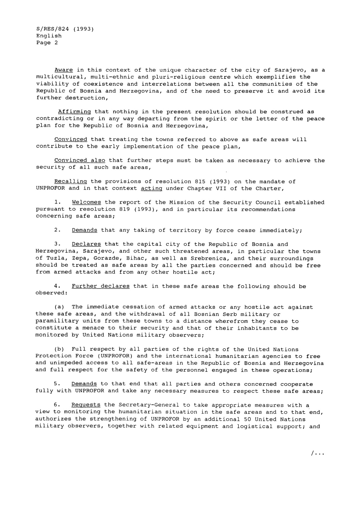 Suočeno sa humanitarnom katastrofom, 16. aprila 1993. Vijeće sigurnosti Ujedinjenih nacija usvajaj Rezoluciju br. 819. U njoj traže da sve strane u sukobu u Republici BiH Srebrenicu i područje oko nje smatraju “zaštićenom zonom,” u kojoj neće biti nikakvih oružanih napada niti neprijateljstava.