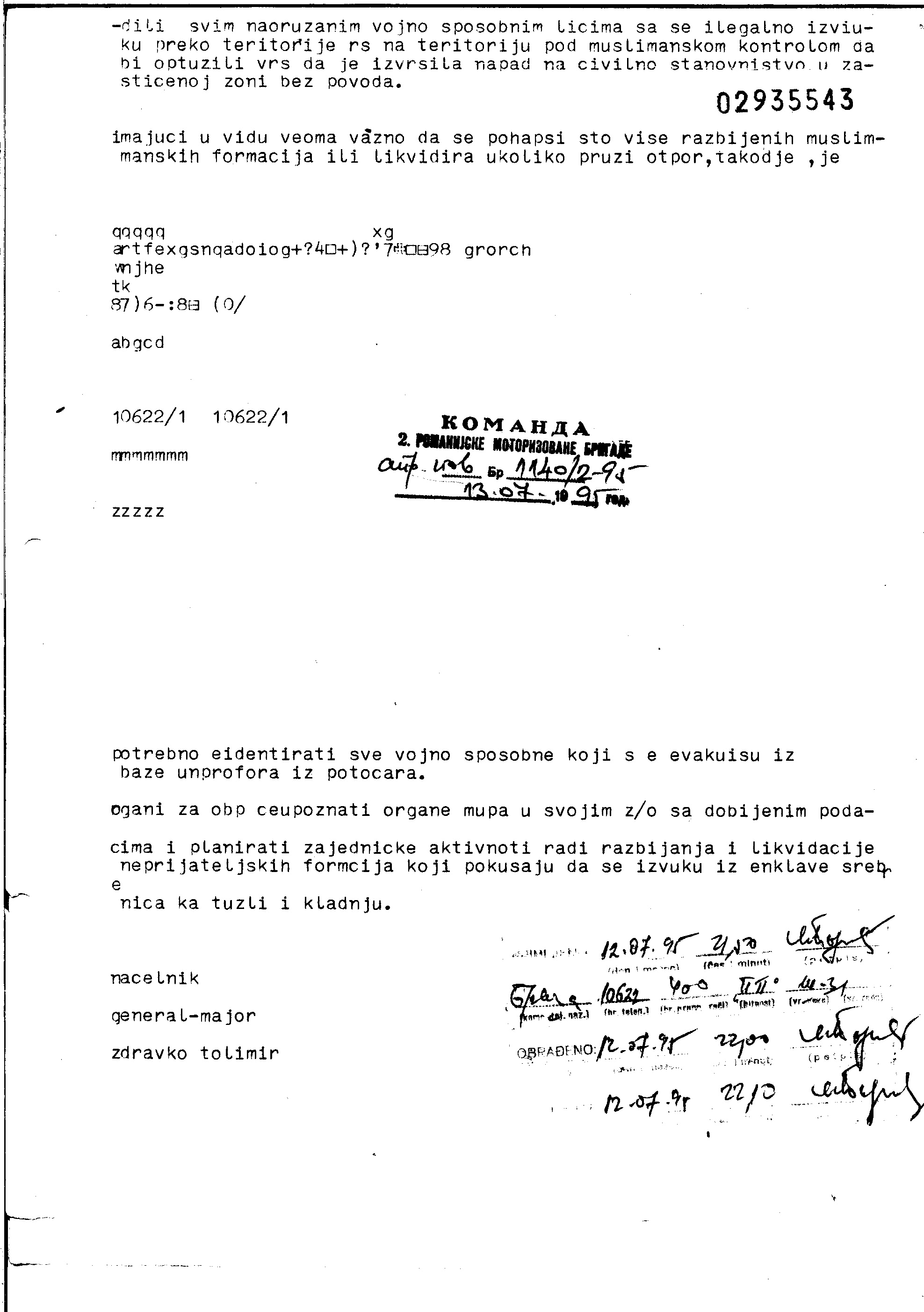 Naredbu je potpisao načelnik general major Zdravko Tolimir, pomoćnik komandanta za obavještajno bezbjednosne poslove Glavnog štaba Vojske Republike Srpske.