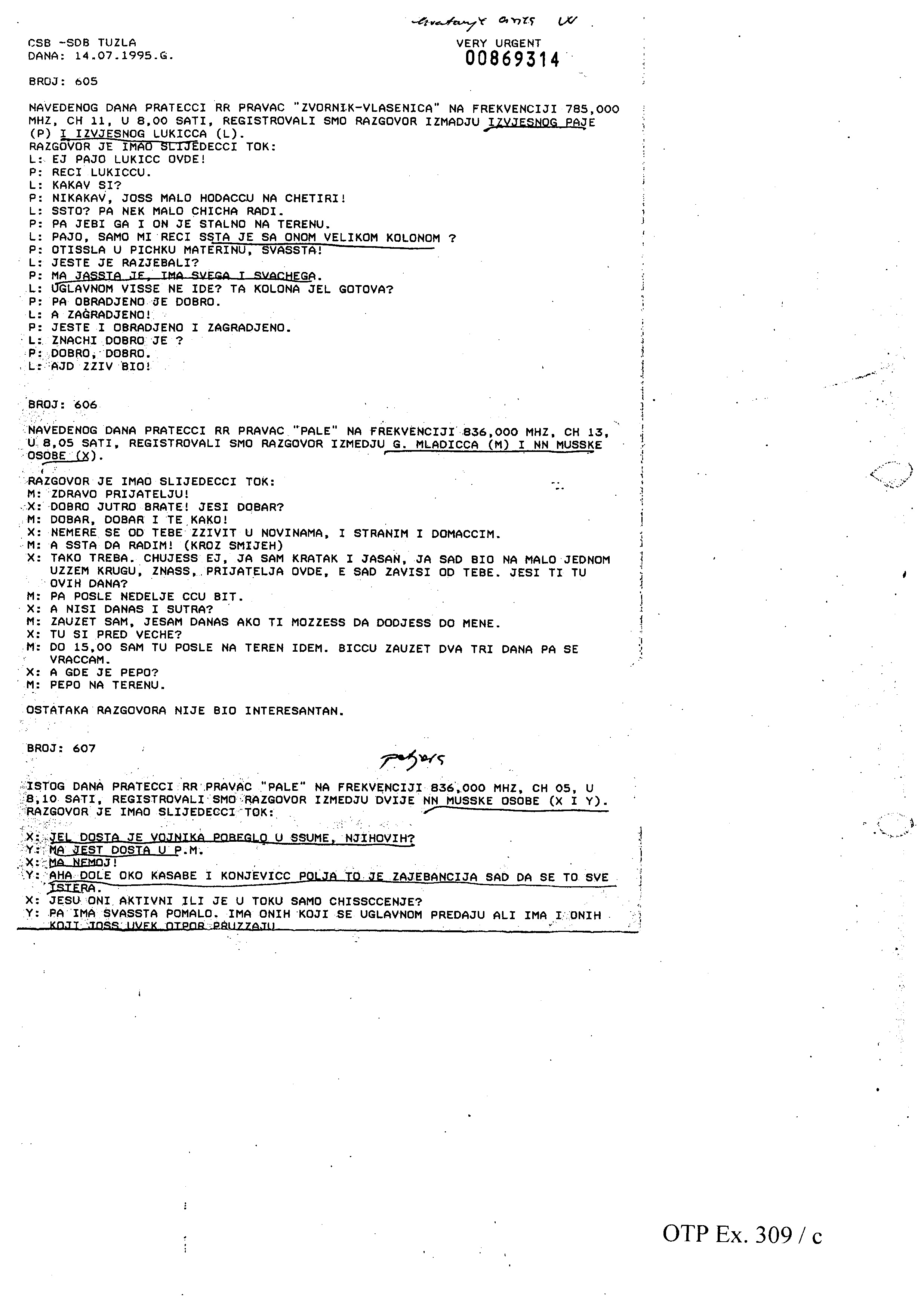 “U periodu od septembra do oktobra 1995., Bratunačka brigada, radeći zajedno sa civilnim vlastima, otkopala je masovnu grobnicu u Glogovi i druge masovne grobnice sa muslimanskim žrtvama operacije ubijanja, i premjestila leševe u pojedine masovne grobnice na širem području Srebrenice. U septembru 1995. godine me je kontaktirao potpukovnik Popović, načelnik bezbjednosti Drinskog korpusa, i rekao mi da obavim premještanje leševa Muslimana iz Glogove.”