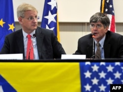 Švedski ministar vanjskih poslova Carl Bildt i zamjenik američkog državnog sekretara James Steinberg tokom sastanka sa liderima u BiH o ustavnim promjenama, Butmir kod Sarajeva, oktobar 2010