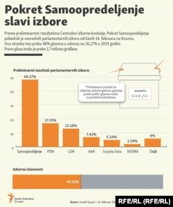 Na osnovu sadašnjih rezultata, Samoopredeljenje je dobilo 47,85 odsto glasova birača ili 56 poslaničkih mesta u Skupštini Kosova. Nakon prebrojavanja uslovnih glasova i onih iz dijaspore, procenjuje se da Samoopredeljenje može da dobije maksimalno još tri poslanička mesta, odnosno 59 od ukupno 120, što nije dovoljno da samostalno formira Vladu.