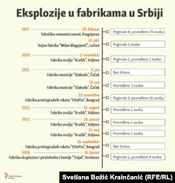 Do eksplozija je, u prethodnih nekoliko godina, dolazilo i u drugim fabrikama namenske industrije u Srbiji. Bilo ih je više od deset. U njima je živote izgubilo sedam osoba, a nekoliko desetina je povređeno.