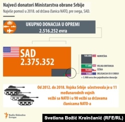 Istovremeno, Ministarstvo odbrane dostavilo je RSE vrednost donacija zemalja članica NATO koja je, prema tim podacima, za 2017. godinu iznosila 4,6 miliona evra.