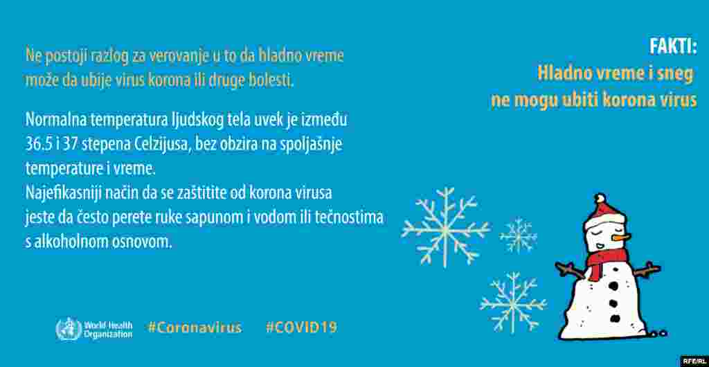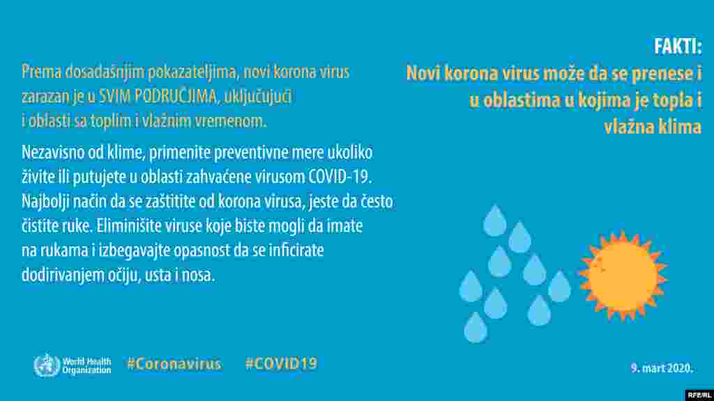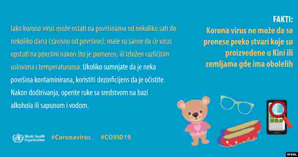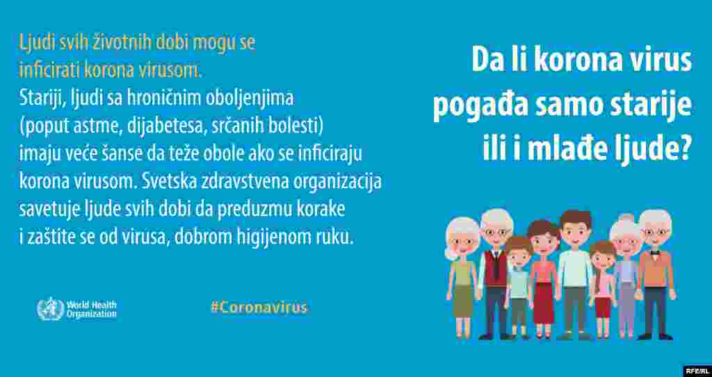 Koliko korona virus opstaje na površinama, da li je otporan na tople ili hladne vremenske uslove, da li su deca zaista zaštićena a stariji ugoženi? Ovo su samo neka od pitanja na koja Svetska zdravstvena organizacija kroz infografike odgovara javnosti.